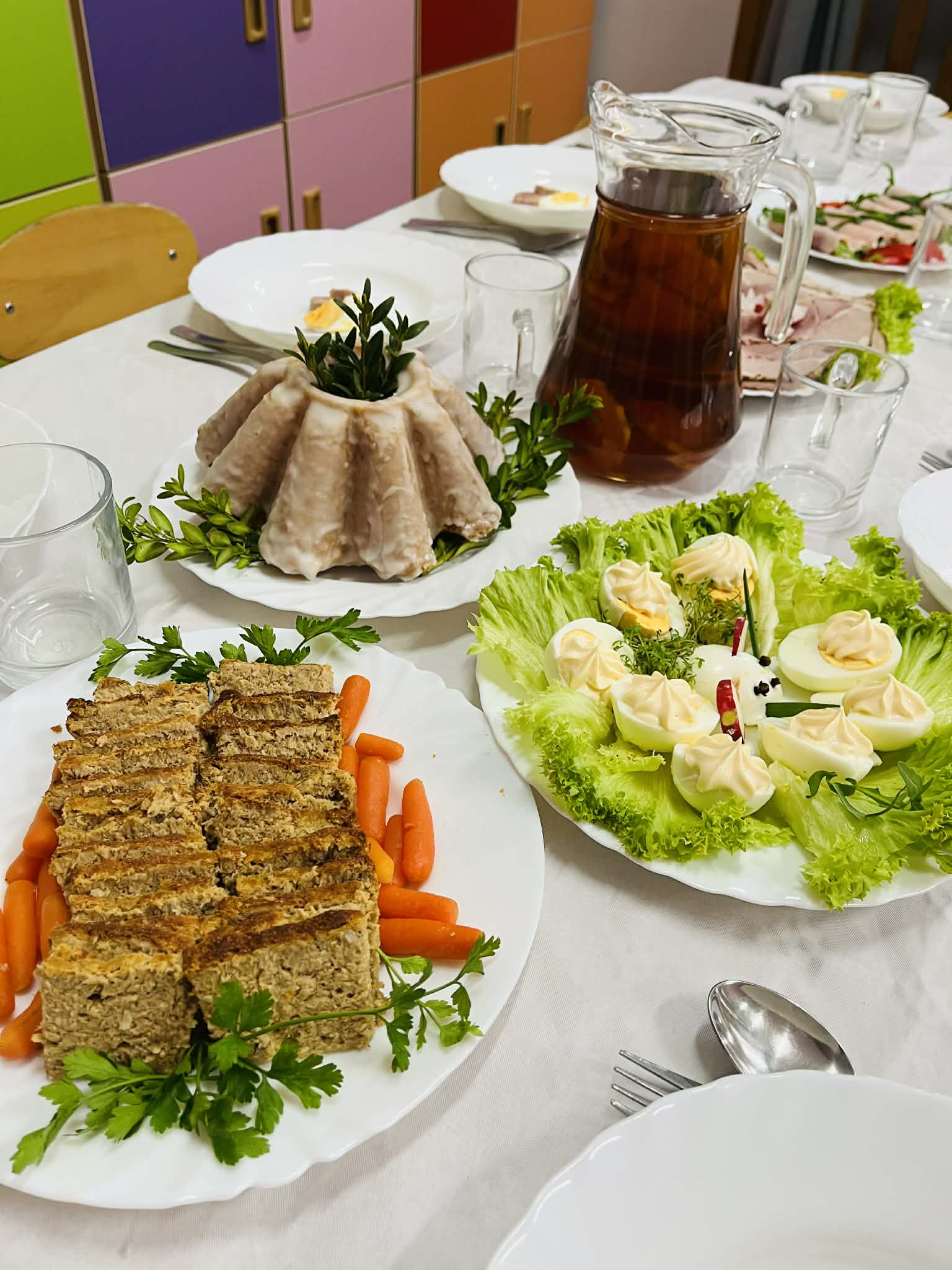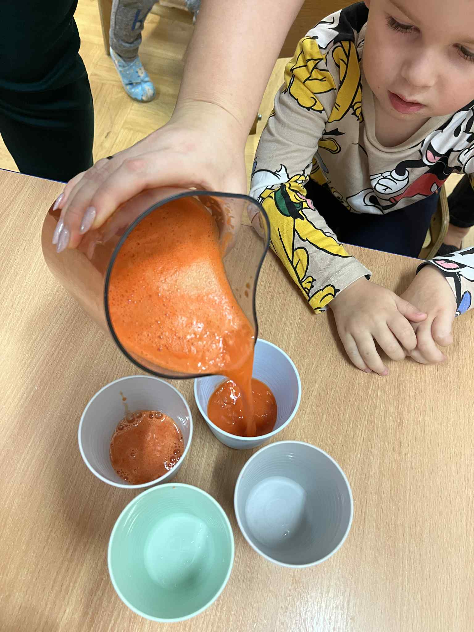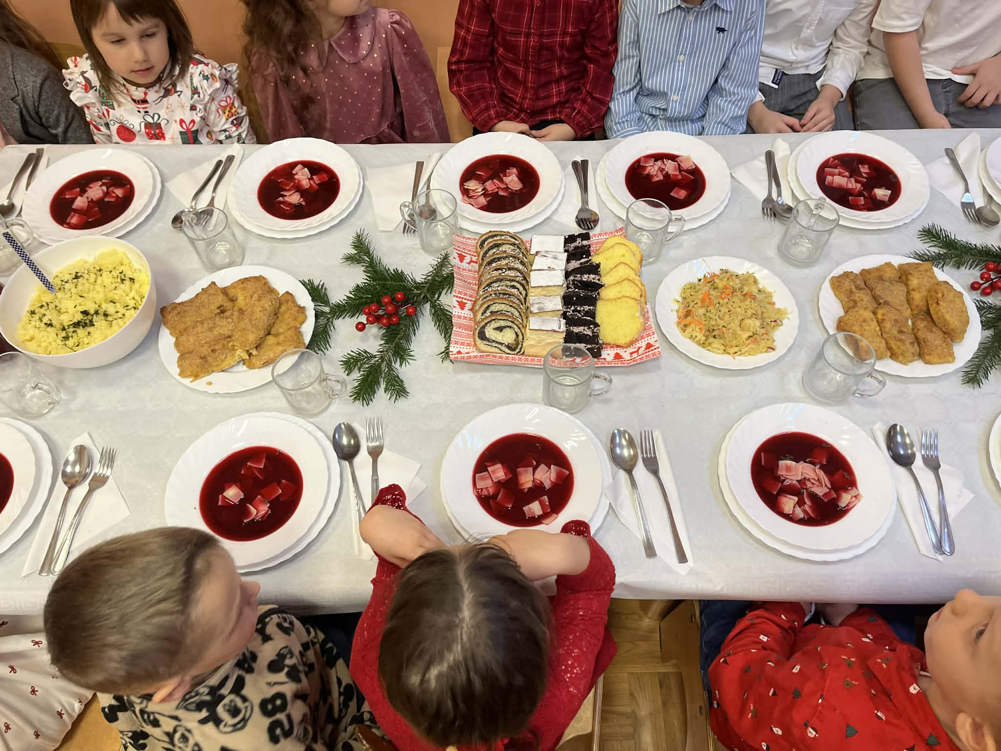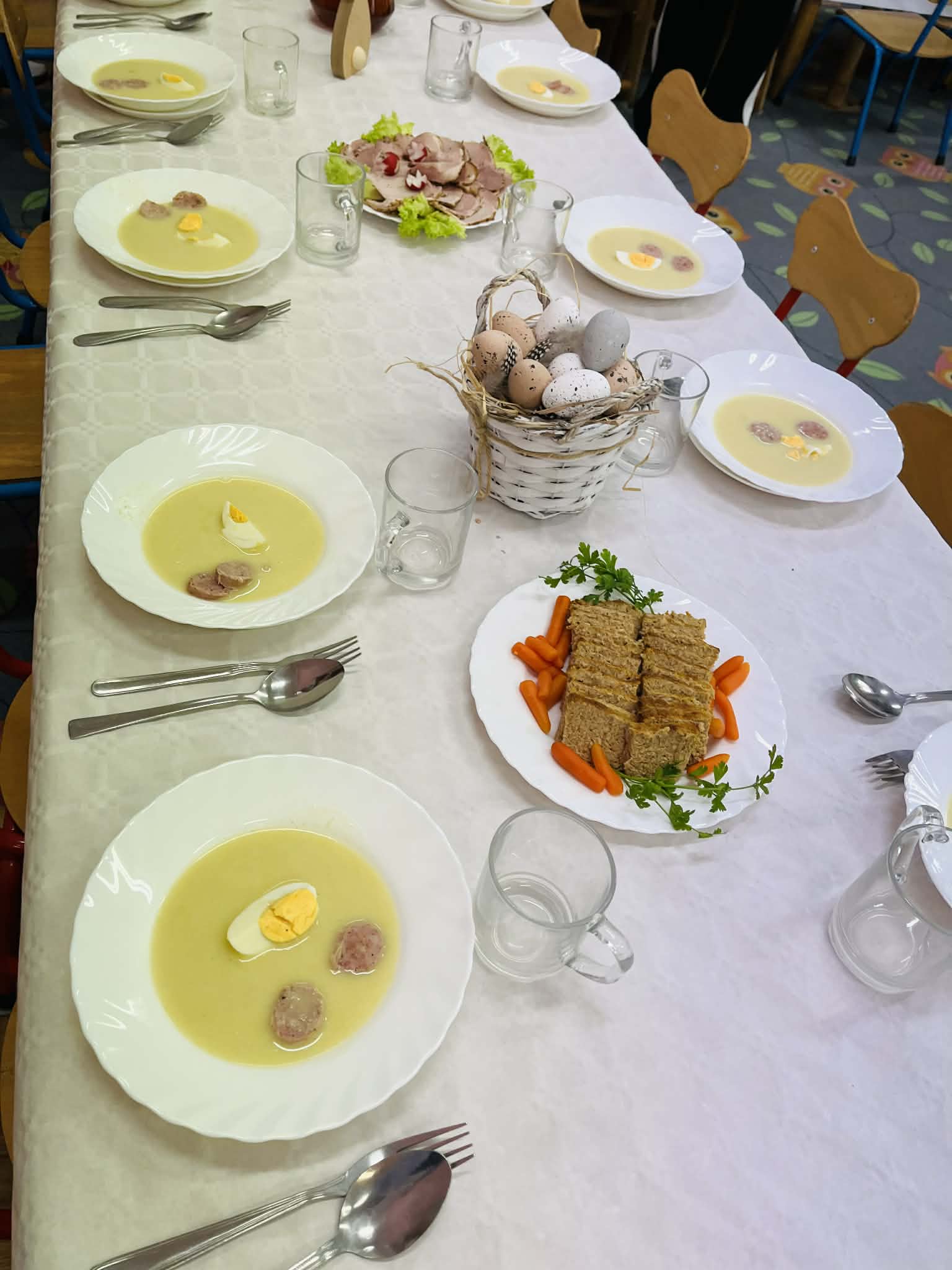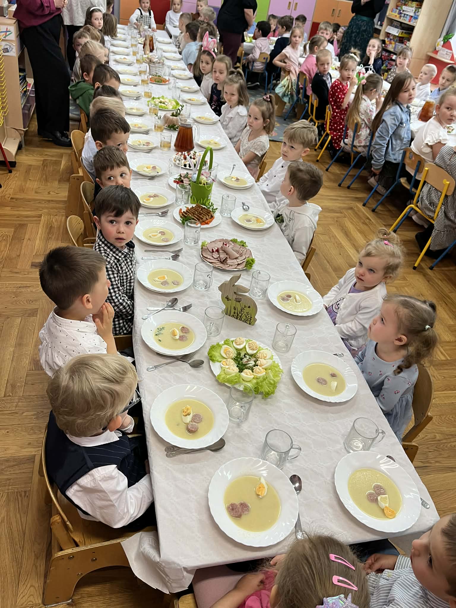 Wspomagamy dzieci w budowaniu pozytywnego stosunku do czynności jedzenia. Wspólne posiłki stanowią dla nich okazję do spróbowania różnorodnych dań i poznania zasad zachowania przy stole. Przedszkole zapewnia swobodny dostęp do wody, na żądanie dziecka. Dzieci nie są zmuszane do jedzenia, zawsze mogą poprosić o dokładkę. Posiłki podawane są o stałych porach.