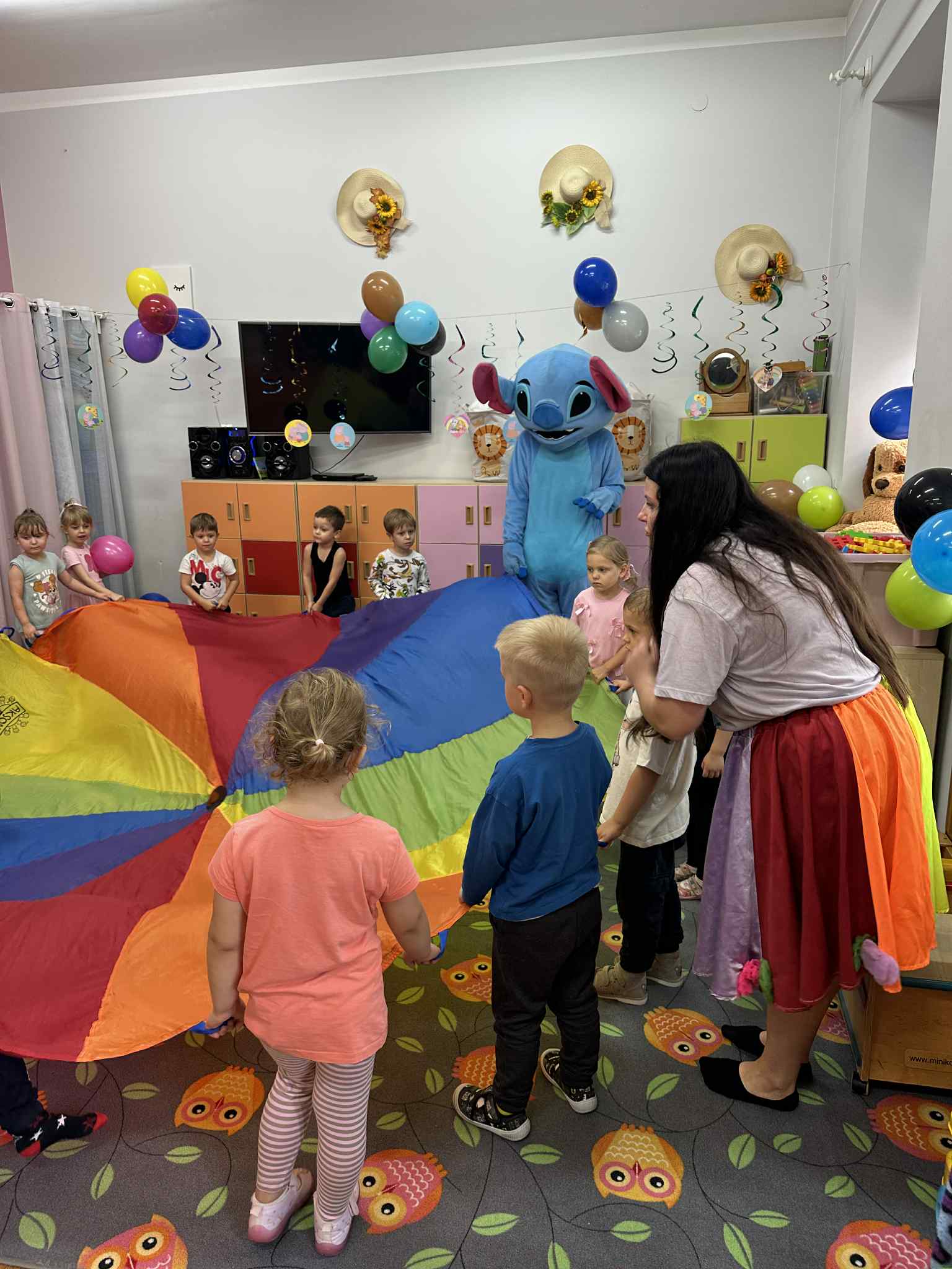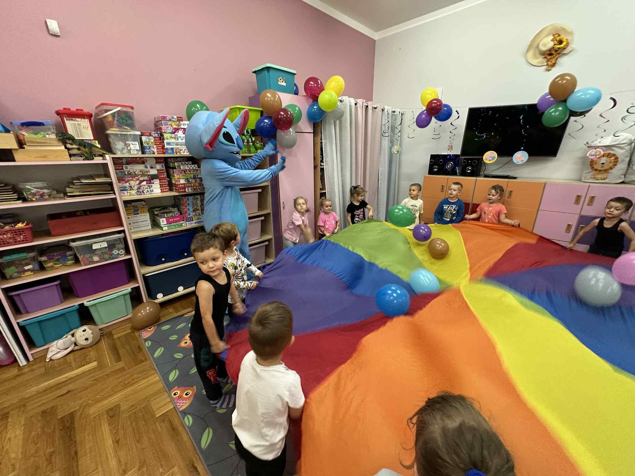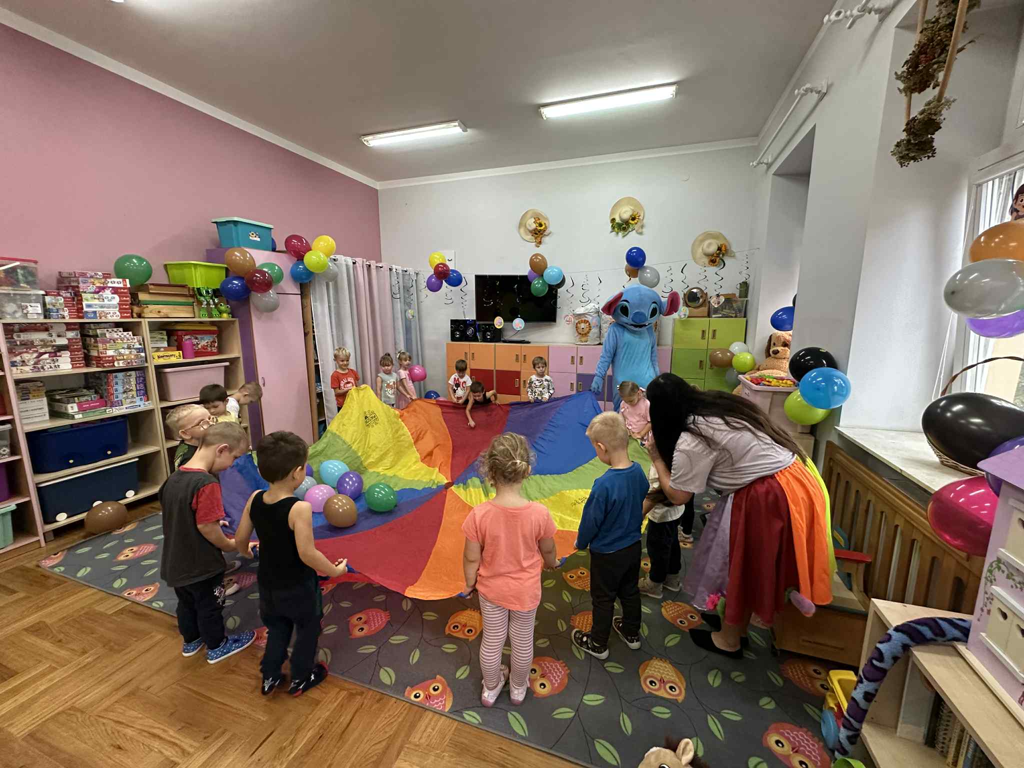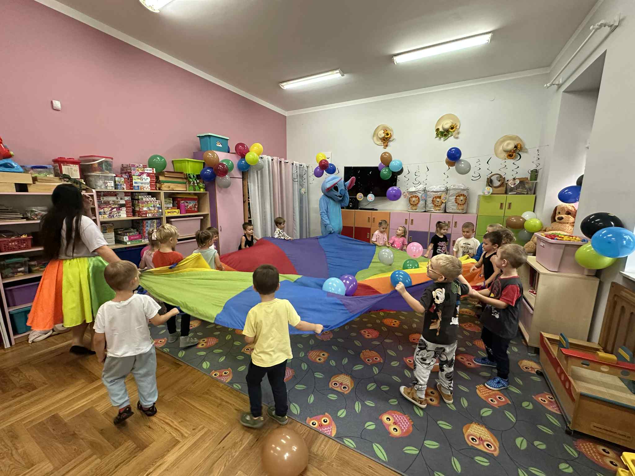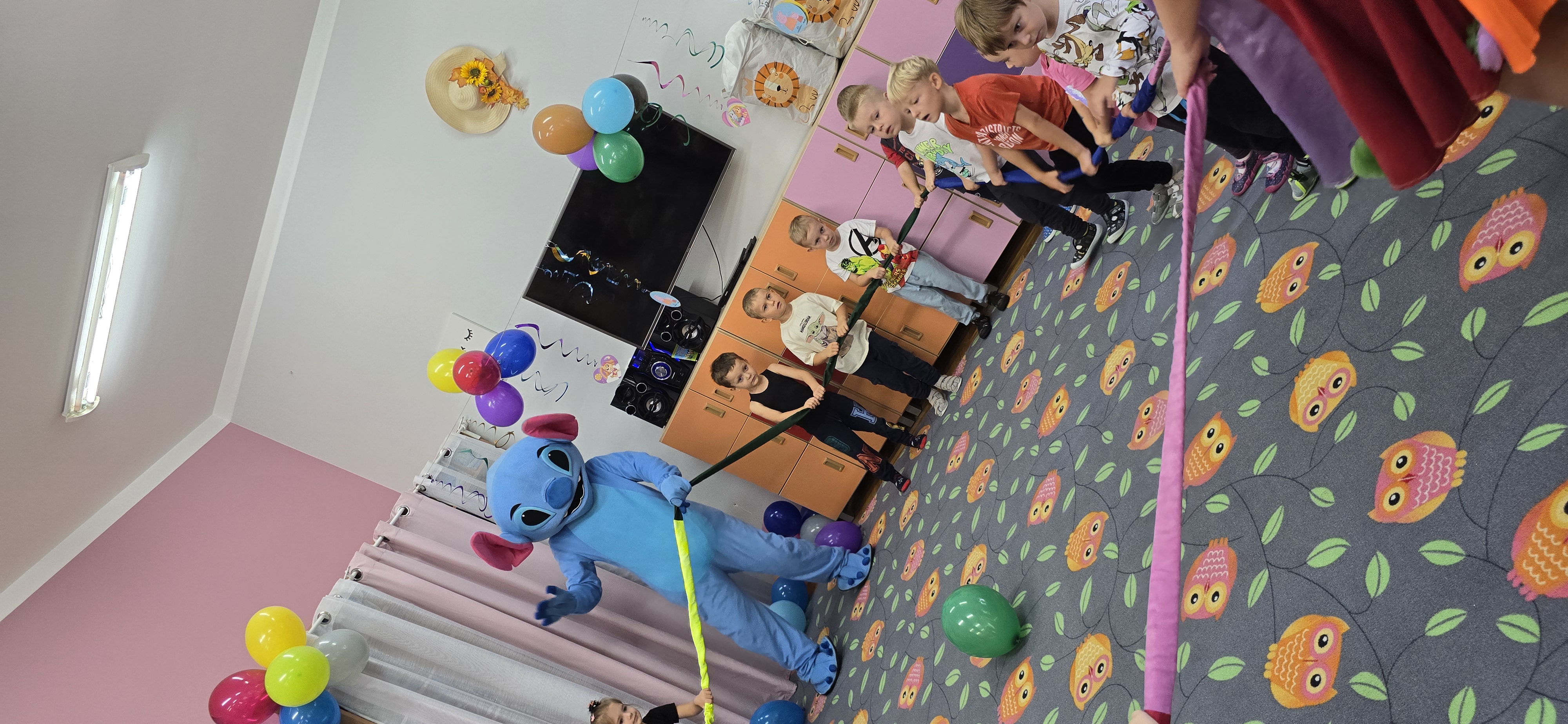 W salach i w ogrodzie rozbrzmiewała muzyka, a dzieci bawiły się wesoło podczas wspólnych tańców, zabaw i swawoli. Nie zabrakło również niespodzianek – każdy przedszkolak otrzymał super upominek, który wywołał wiele uśmiechów i radości.