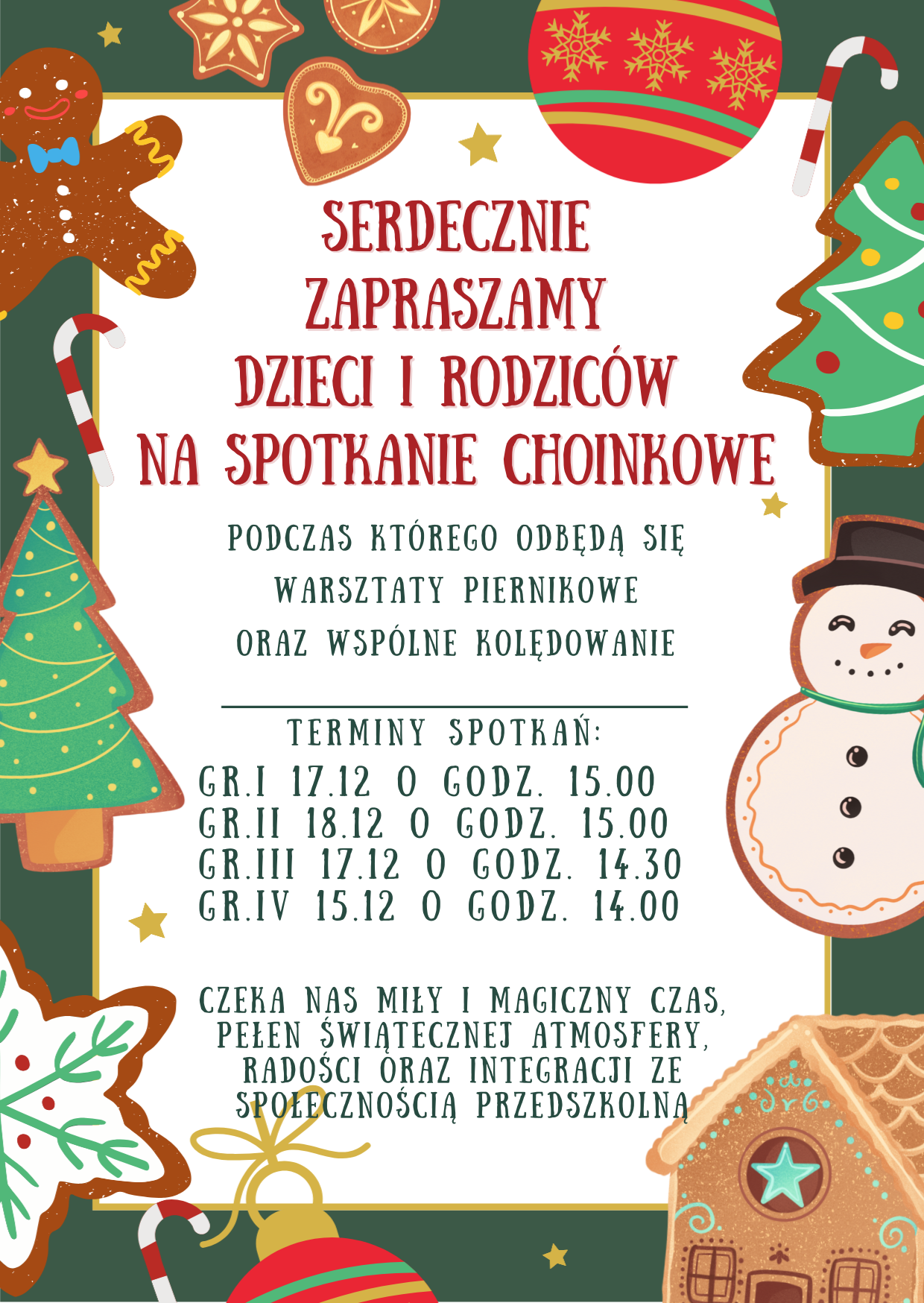 Serdecznie zapraszamy dzieci i Rodziców naszych przedszkolaków do wspólnego spotkania przy choince, które odbędą się w terminach podanych na plakacie. Podczas spotkania odbędą się warsztaty piernikowe oraz wspólne kolędowanie w miłej, świątecznej atmosferze.