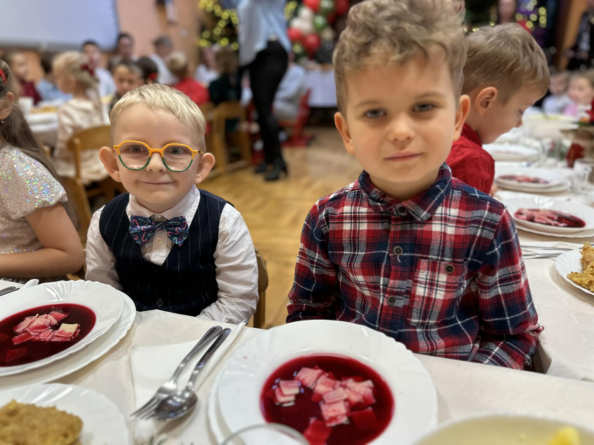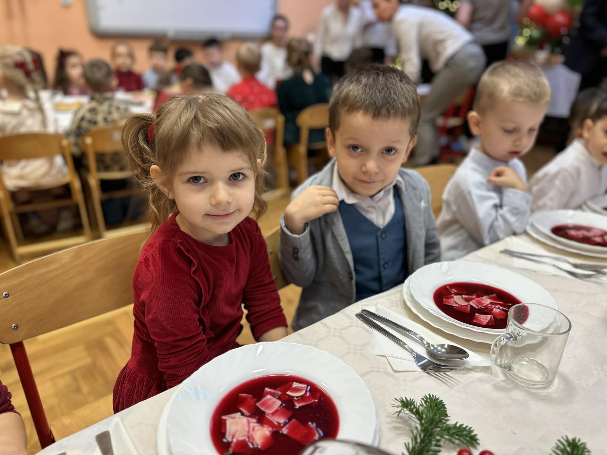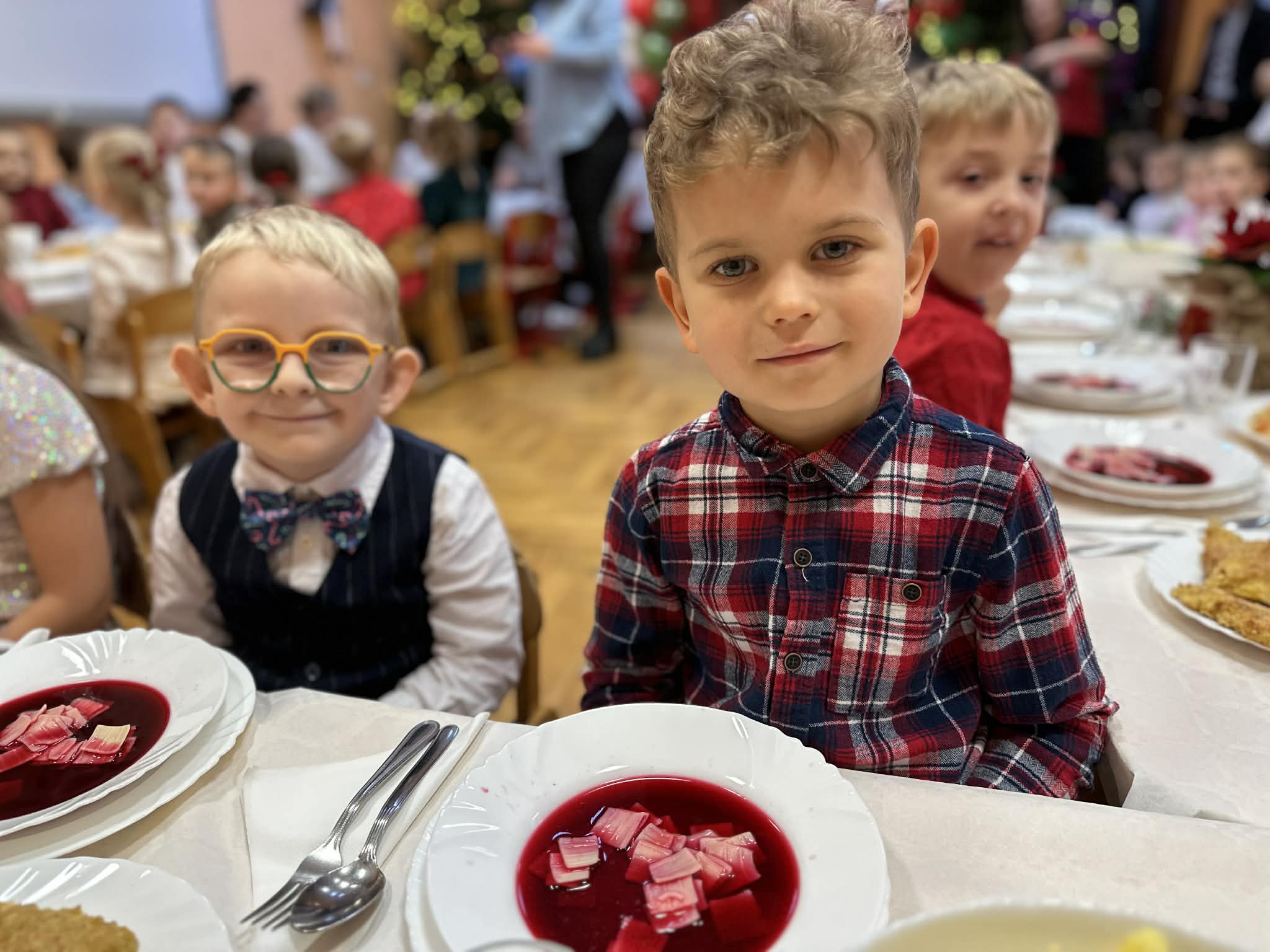 W dniu dzisiejszym w naszym przedszkolu odbył się Świąteczny Obiad, który zgromadził wszystkie dzieci oraz pracowników. Był to wyjątkowy, pełen ciepła i radości czas – wspólne chwile przy stole, uśmiechy, rozmowy i świąteczna atmosfera sprawiły, że poczuliśmy prawdziwą magię nadchodzących Świąt.