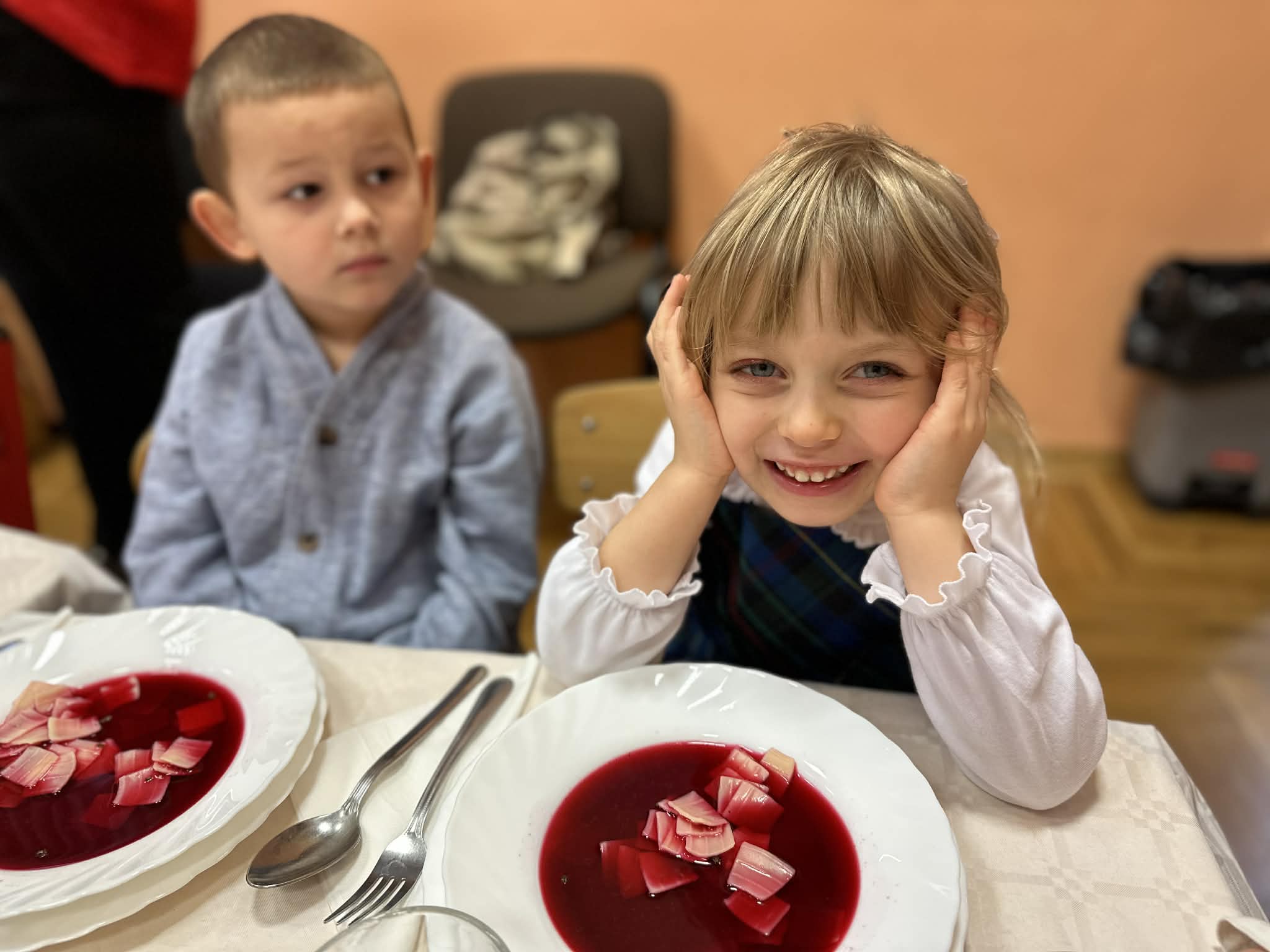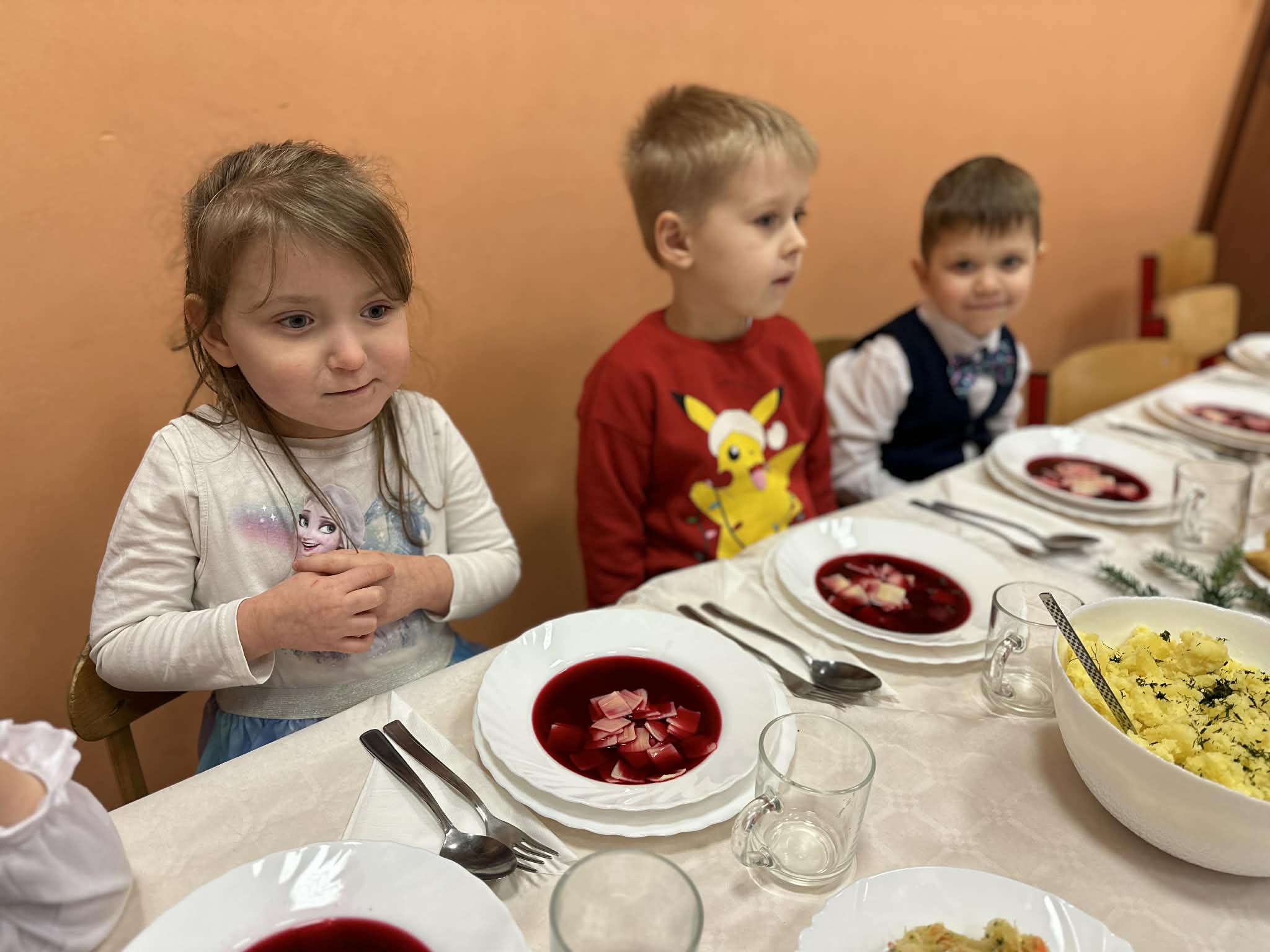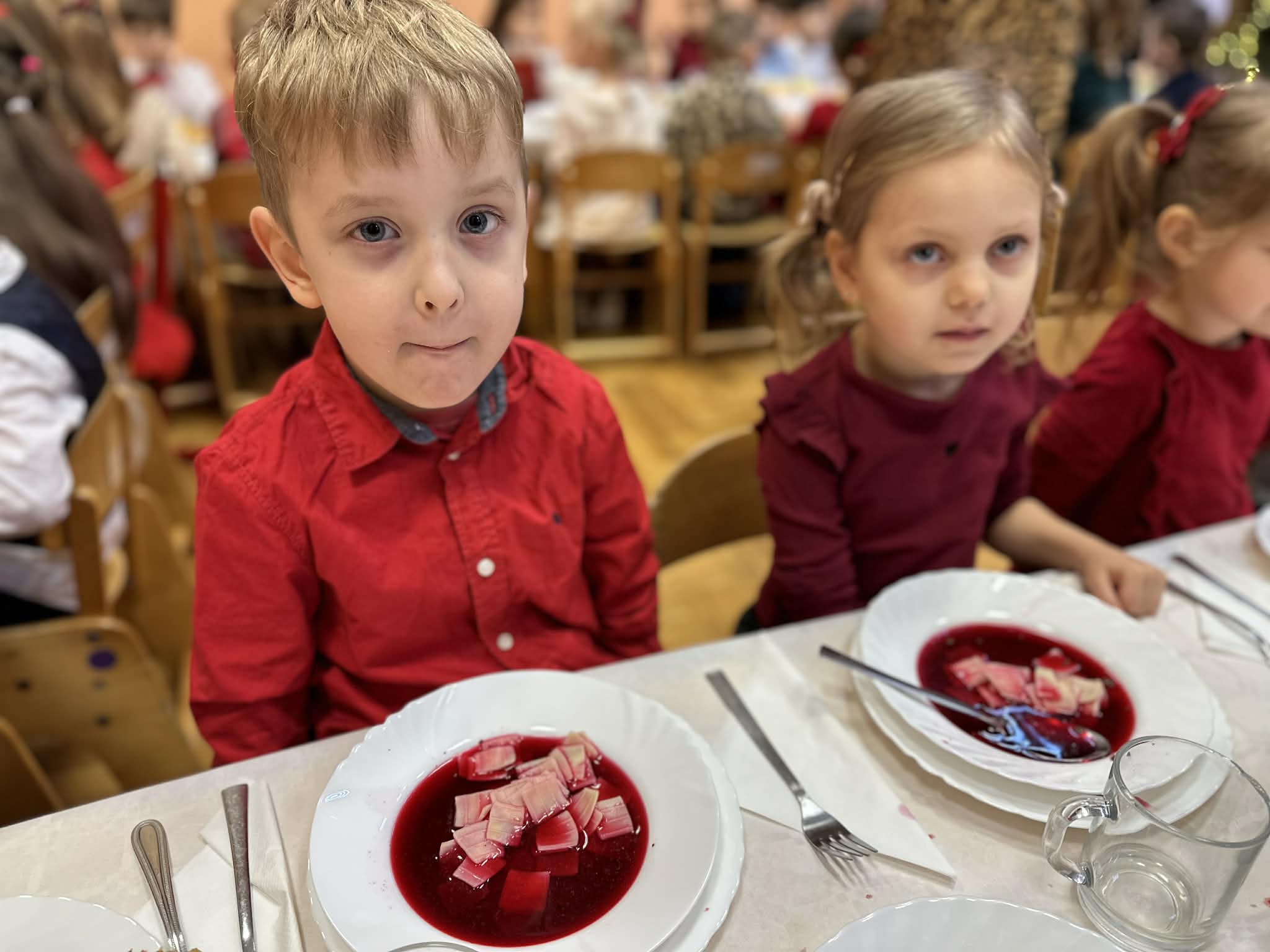 W dniu dzisiejszym w naszym przedszkolu odbył się Świąteczny Obiad, który zgromadził wszystkie dzieci oraz pracowników. Był to wyjątkowy, pełen ciepła i radości czas – wspólne chwile przy stole, uśmiechy, rozmowy i świąteczna atmosfera sprawiły, że poczuliśmy prawdziwą magię nadchodzących Świąt.