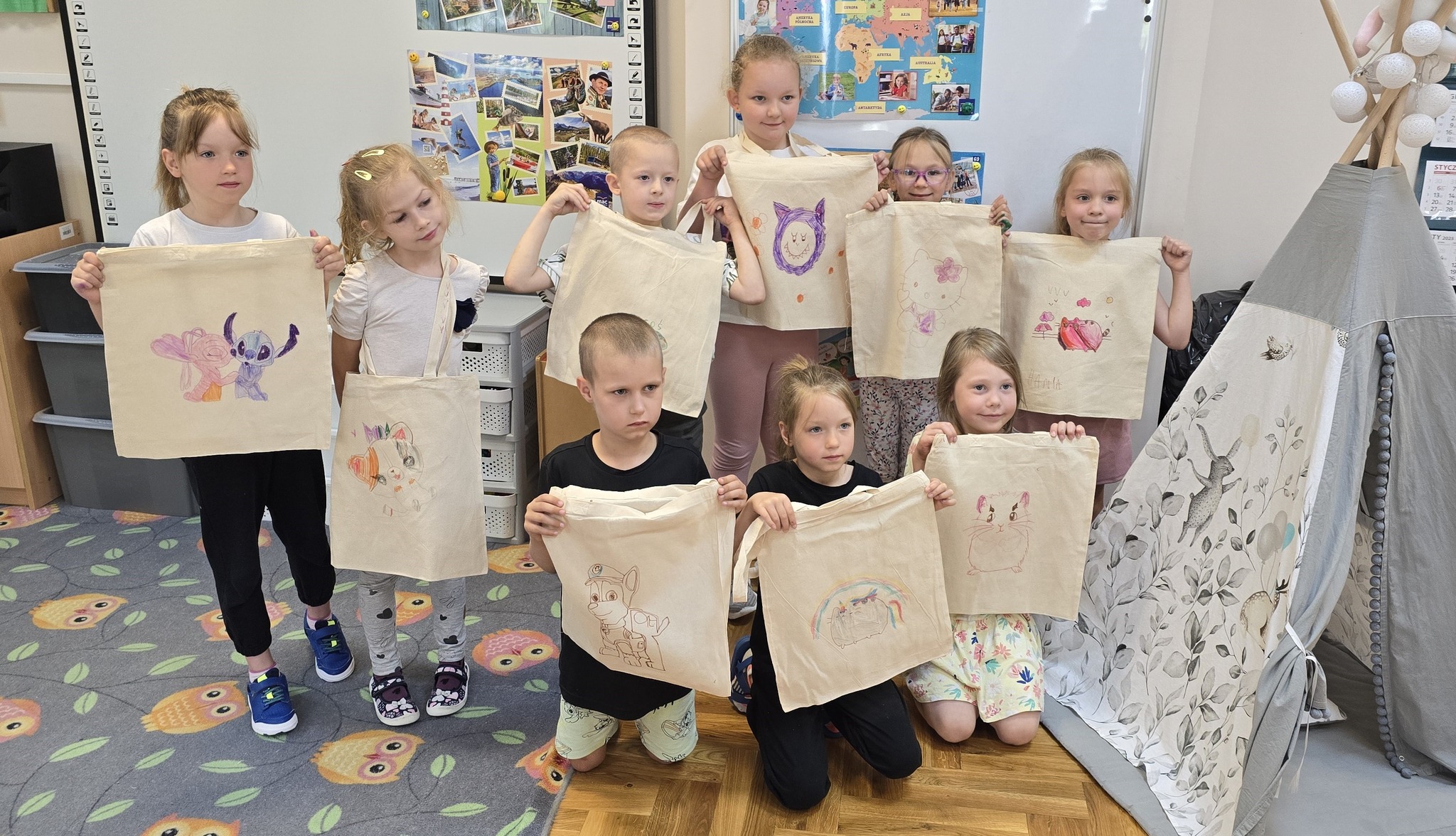 Dzisiejszego dnia dzieci z grup Maki i Niezapominajki segregowały odpady, rozmawiały o tym, dlaczego jest to tak ważne dla nas i naszej planety, a w nagrodę za zaangażowanie i aktywne uczestnictwo w zajęciach, przepięknie ozdabiały bawełniane torby na zakupy?♻️??.