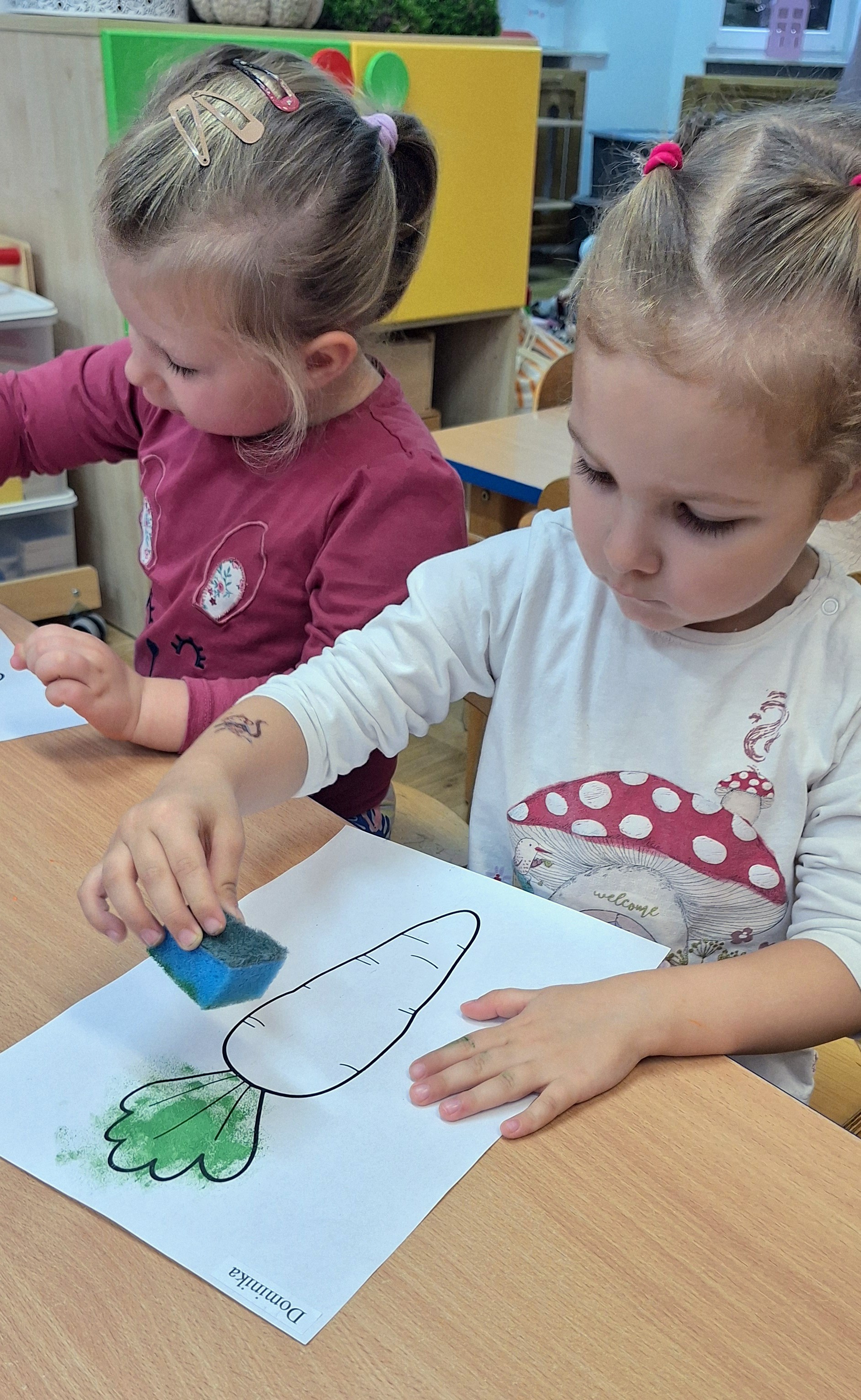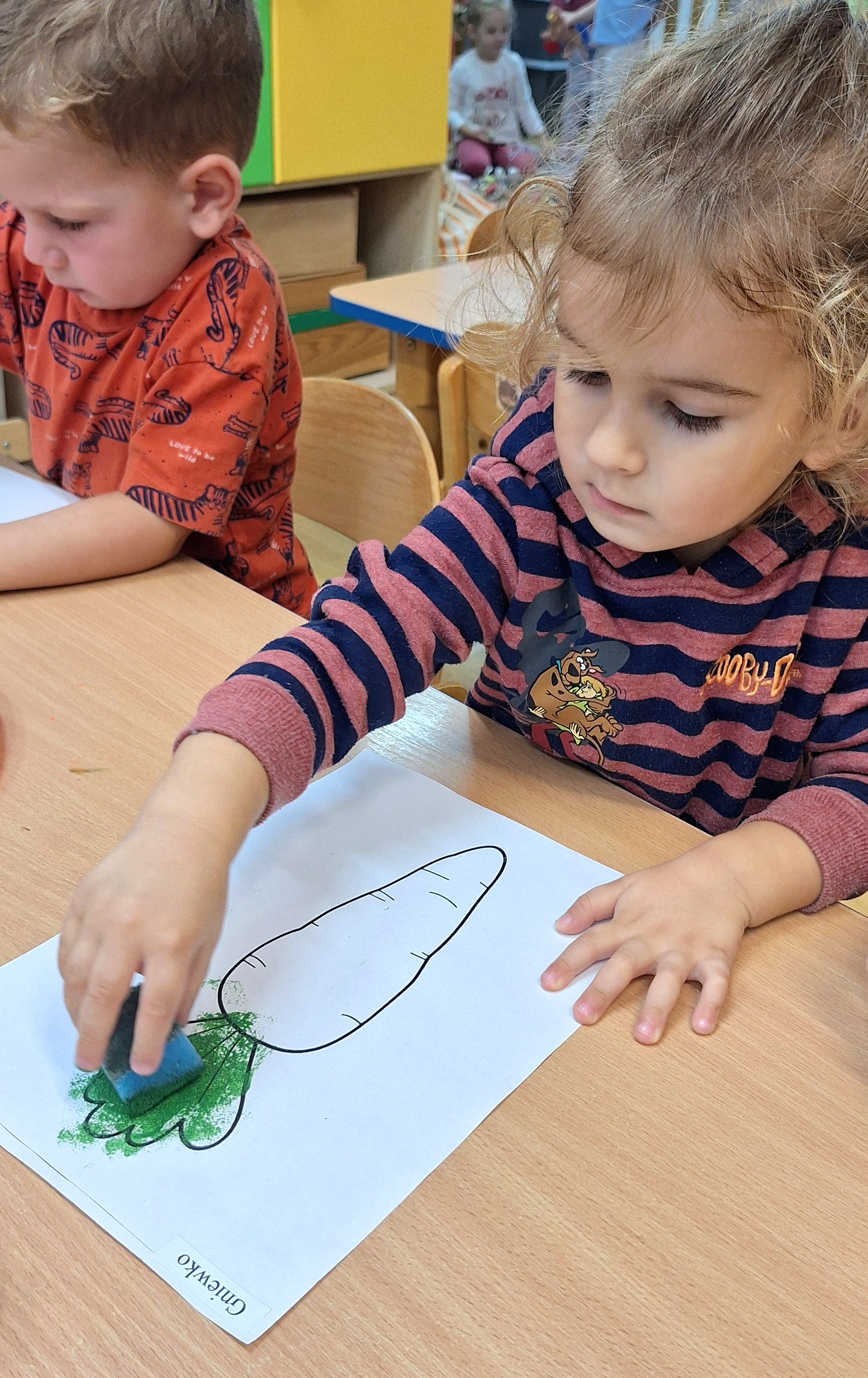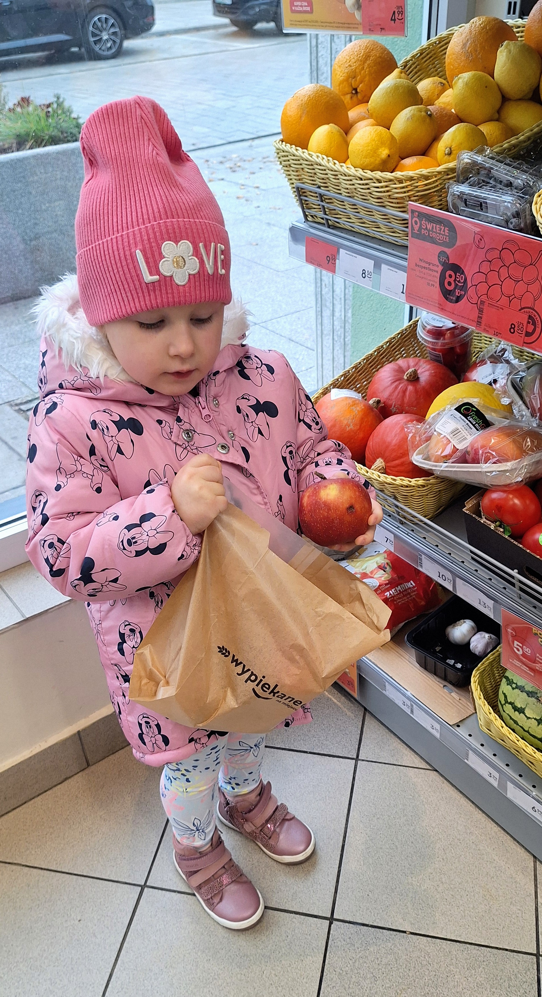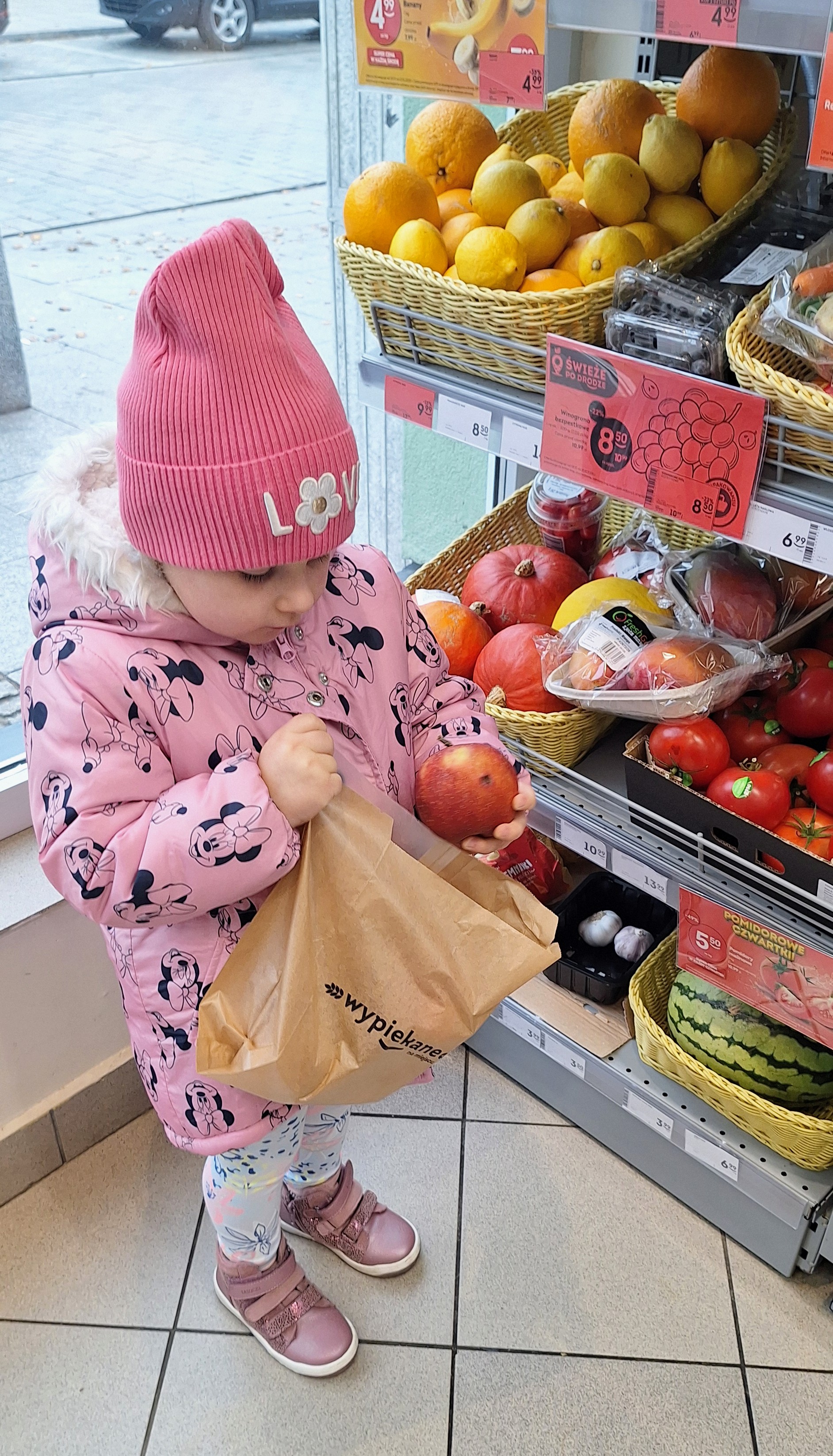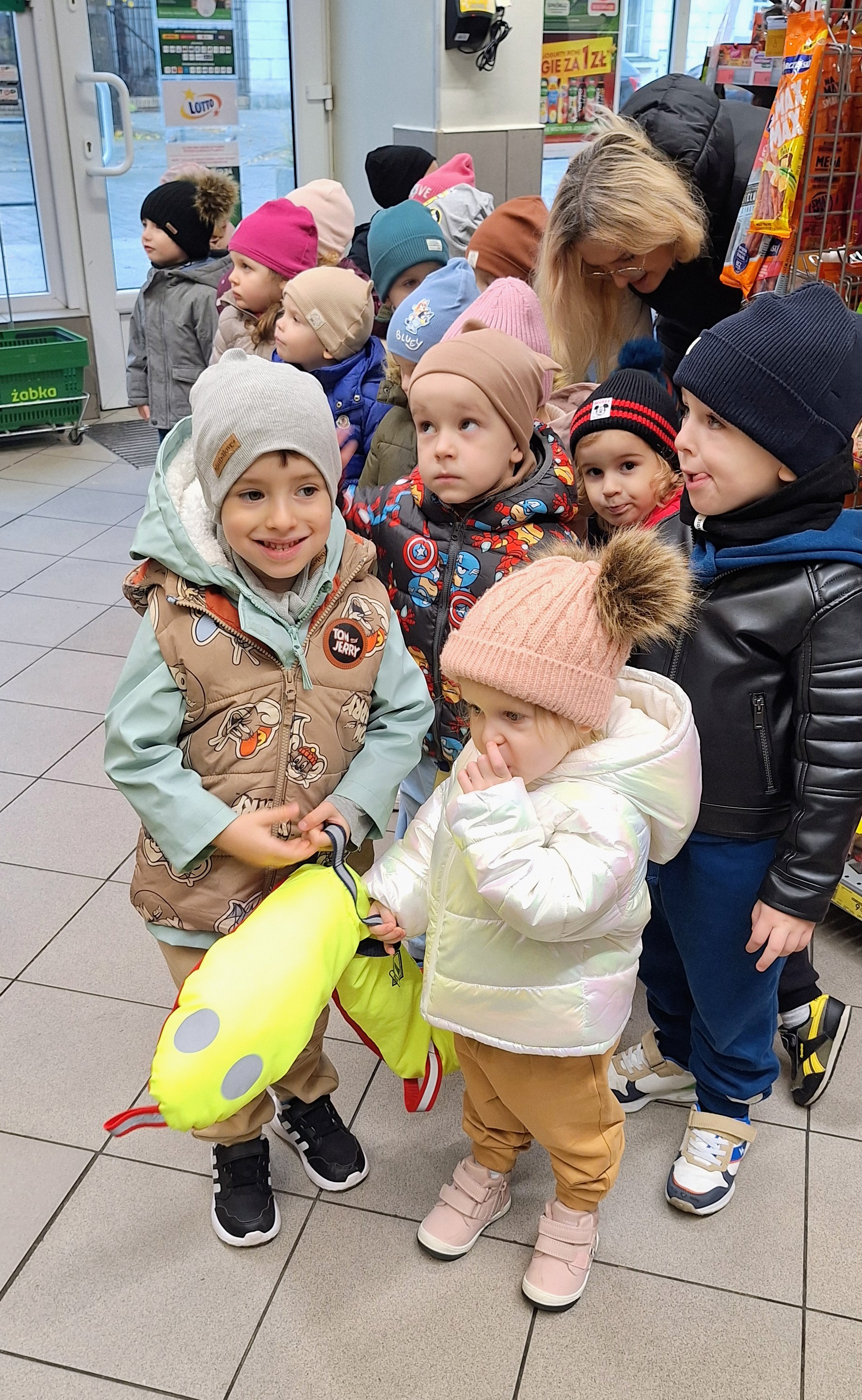 Z tej okazji wybraliśmy się na prawdziwe zakupy — po marchewki i jabłka na pyszny sok. Takie wyjście do sklepu to nie tylko świetna zabawa, ale też nauka: dzieci uczą się bezpiecznego poruszania się w przestrzeni publicznej, kulturalnego zachowania, cierpliwości podczas czekania, a także samodzielności i współpracy w grupie.